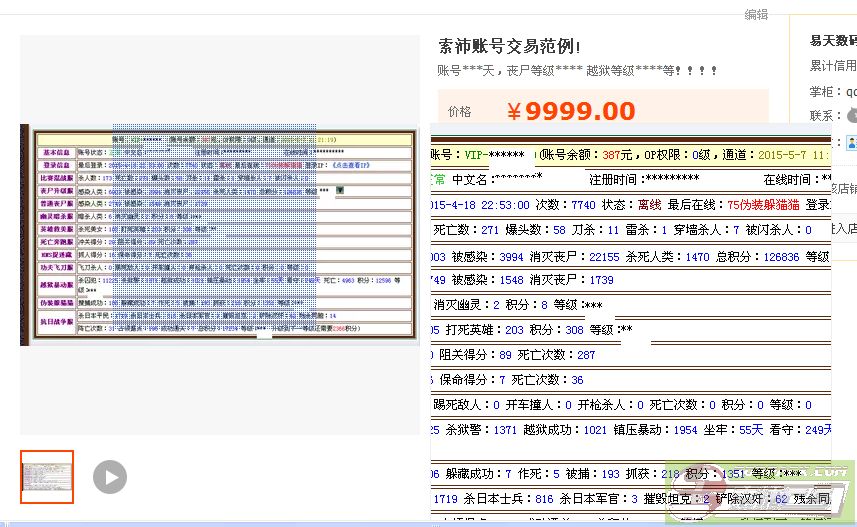 | -- 作者:nono2000 -- 发布时间:2015-04-20 10:58:00 -- 卖家方流程说明: 没有支付宝的朋友可以去淘宝申请个账号,然后再申请支付宝,有些特殊群体无法绑定快捷支付,可以去附近的便利店,美宜佳等进行账号充值! 第1步,请用要卖的该账号短信PM我,(告诉我,可以通知联系你的论坛小号),要出售该账号,并且说明你要出售的价格,然后支付宝转账保证金10元到:13798556316(别转错了和没转也说转了,本人保留最终解释权) 第2步,请用要卖的该账号在本板块开贴,主题格式:账号(出售账号名)交易动态帖,请以这个格式发主题,其他不受理,表明你要出售该账号,附带你支付宝转账保证金10元的截图(请不要其他相信发短信给你的人,本人无任何小号) 第3步,本人受理,进行账号上架! 第4布,账号被拍下,交予我该账号和密码,若无任何问题本人在7日之内转账到交纳保证金的账号之中,本人并且在该版块开贴说明交易完成,此号已经售出!!! 卖方要改价请用要出售的账号短信PM我,账号一旦上架,卖方要求下架不卖了,本人恕不退保证金! 备注:出售的账号价值300元以上被拍下,本人将退回10元保证金,由于支付宝体现税率和本人辛苦费,所有出售账号本人一律收取百分之10手续费(不算坑了,忙前忙后的) ————————————————————————————————————————— 卖方发交易帖格式说明: 我先发下卖方如何开贴标准范例,主题为:账号(出售账号名)交易动态帖,请已这个为标准,其他均不受理! 要出售的原因:我因为*****事情或原因,不玩了,出售该账号! 账号卖点:丧尸****级,越狱*****级等,非常的吊,有多牛逼,详情看下列图!!! 1。账号登陆首页截图: 2.帖子楼层主页截图,一定把赞助金额区间截图出来,还差多少升级到什么代理? 3.游戏战绩截图(有SP需截SP战绩图): 4.有无案底截图: