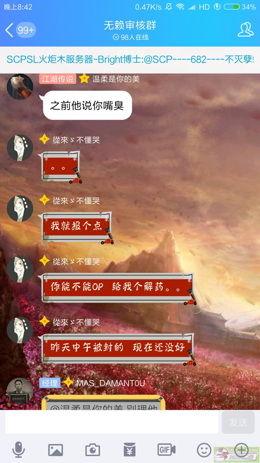 | -- 作者:Oo116oO -- 发布时间:2018-07-26 9:01:00 -- 我有特殊的骂人方法. 点击浏览该文件你说你只是报点被我权限了,那你麻烦听听11分35这段我自录的demo好吗 此主题相关图片如下:![]() 真的那个战队群里都不缺小孩子 我在这里给你备个案 要投诉我你快去吧