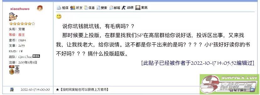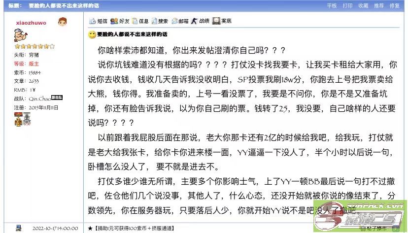 坑钱那是不是要带上我朴彩英啊,毕竟188挺香的555我真的是懒得理你,照你这么说,朴彩英是不是也坑钱啊?啊? 王俊之前让我上的暴发户那个号,我说虐人,他说你刷就行了,我不在你上老暴的号,然后他就把卡发我,我去刷啊,还有哪个什么每次2亿3亿,毕竟他说啥你信啥,对呗,嘿嘿 还有那个票我都懒得解释,dageda 这个号本来就是他21年的时候给我的,只不过我没怎么用,sp 选举的时候我也有上这个号刷分,那天他刷完分,没跟我说啊,我隔了两天上去一看,有分,那号我在用,我还不能投票咯意思是?后面他找我了,我也给他转账了啊,也别说18万,18万分上截图,转账也上截图,别拿嘴行不行啊