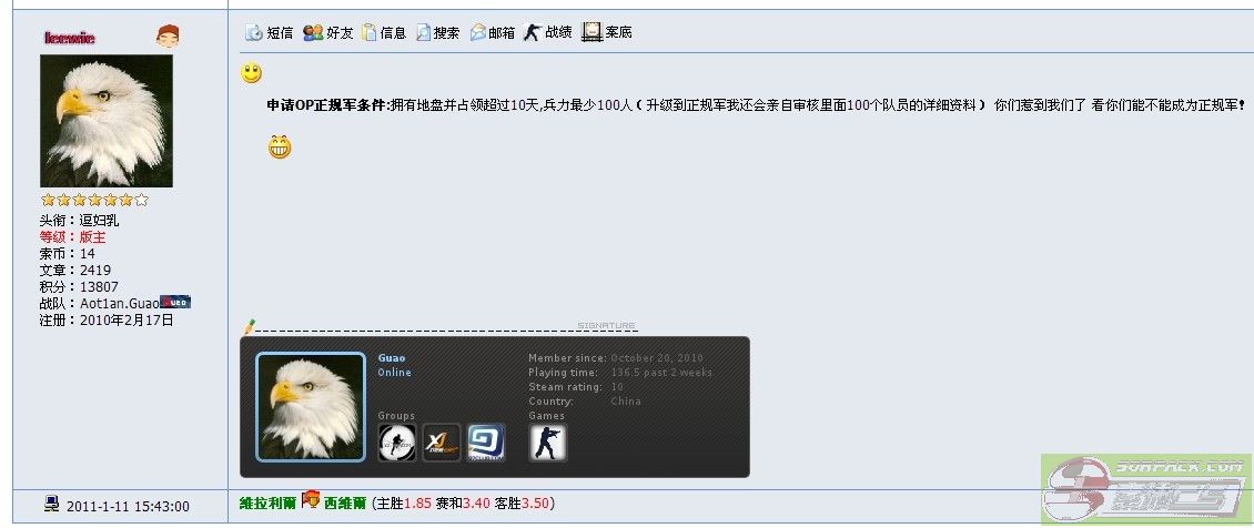 | -- 作者:leewie -- 发布时间:2011-01-11 16:10:00 -- 以下是引用TianZhi在2011-1-11 16:02:00的发言: 你以后也不用在我们版块发表这些高调言论,搞得自己战队像美国一个 还有,67服,别老是在自己队宣传你们有多大能力守服,不全靠那点机器人,你认为你能守住? 真是笑话,还随时开贴表扬大家守得好,你减掉机器人的分数自己算算吧 记得上次你们领先了我们 1000多分 我们照样追回来!67丢了不要紧 但我们不会让你们地盘驻守超过5天!到时候你们也别想成为正规军! |