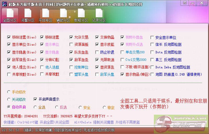 | -- 作者:520pmslsa -- 发布时间:2014-12-05 23:22:00 -- 文件名:Tre Hack 最终版本.exe 全图:最好别和路人使用该工具,只限于娱乐,和朋友一起玩时候可以使用...分类:作弊 ———————————————————————————— 文件名:WSH2009.exe 助手:让你玩魔兽更方便,能改键,能刷屏.能改名,能录像,万能的助手....但不属于作弊(在11对战平台分类为作弊) 此主题相关图片如下:![]() 此主题相关图片如下:![]() 此主题相关图片如下:![]() 此主题相关图片如下:![]() 此主题相关图片如下:![]() 此主题相关图片如下:![]() [此贴子已经被作者于2014-12-5 23:34:08编辑过]