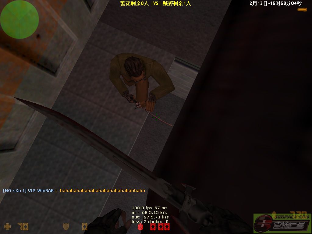好久没玩了,今天上一次服务器,还是在被虐的一边。。这一局很快的我的队友们都挂了,还有1分钟30秒左右吧,不过nuke是个比较好的地图,这个点是我以前在某个丧尸服的帖子里面看到的,一般没有会找的都能拖延1分钟左右的时间闲着没事数T买轻功的次数,到回合结束大概有10来次吧
