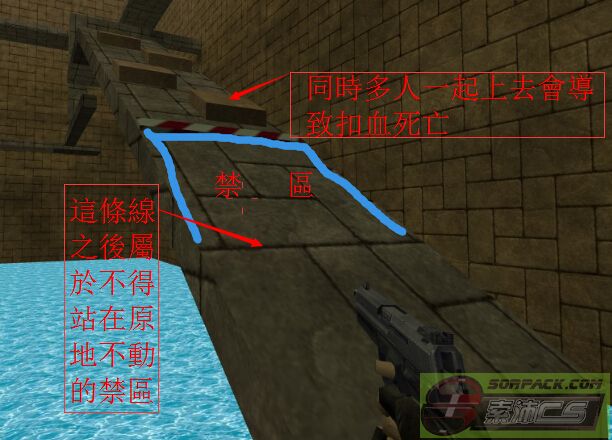 何謂禁區:如圖,這個地方要是同時兩人上去的話,其中一人會被扣血直到死亡,必須一個一個上去,為了以防有人惡意站在禁區不動導致要上去的隊友扣血致死,特地規劃一個禁止站在原地不走的禁區。