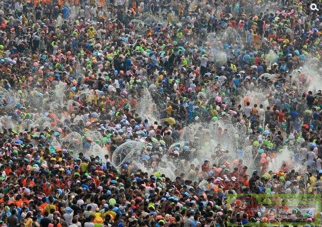 4月15日,数万名当地群众和游客在云南省西双版纳州景洪市泼水广场上泼水狂欢。当日是2014年西双版纳泼水节,也是傣历1376年新年节系列活动的最后一天,数万名当地群众穿上节日盛装,和外地游客一起在云南省西双版纳傣族自治州景洪市互相泼水,互祝吉祥、幸福、健康。泼水节是傣族人民送旧迎新的传统节日,已有上千年历史。