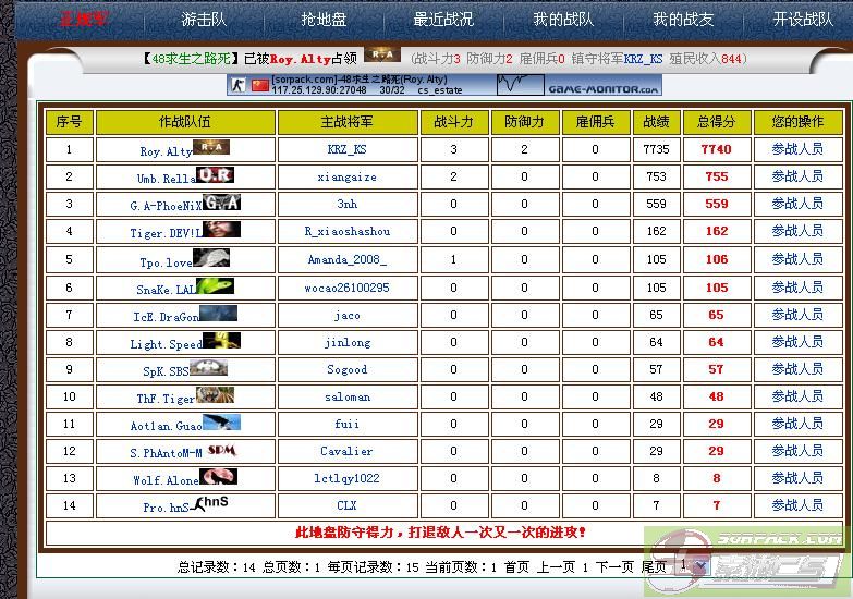 攻打下一个服务器最高分者均获得抢地盘金钱30%