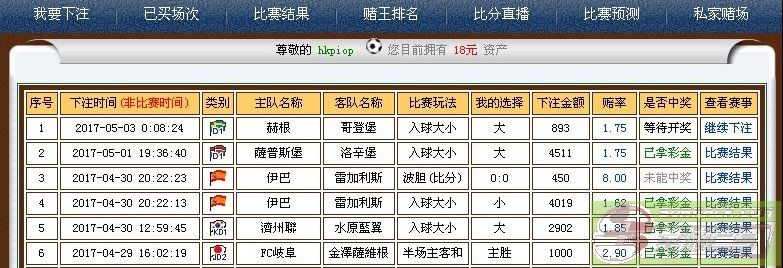 | 1 | 2017-04-29 16:42:38 | ![]() | 愛斯賓奴 | 巴塞隆拿 | 主客和 | 客胜 | 700 | 1.12 | 您中奖啦(点击兑奖) | 比赛结果 |