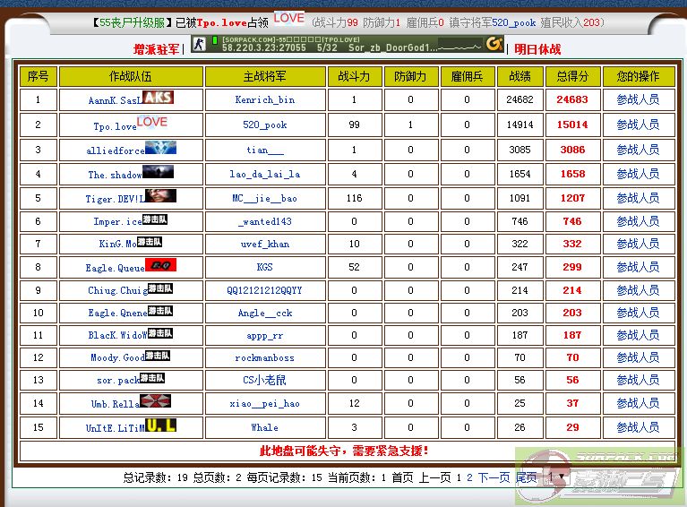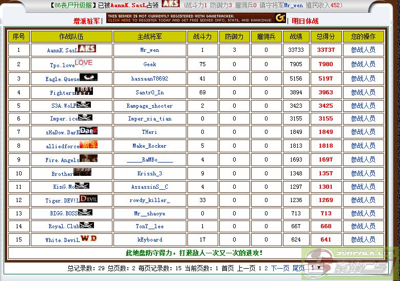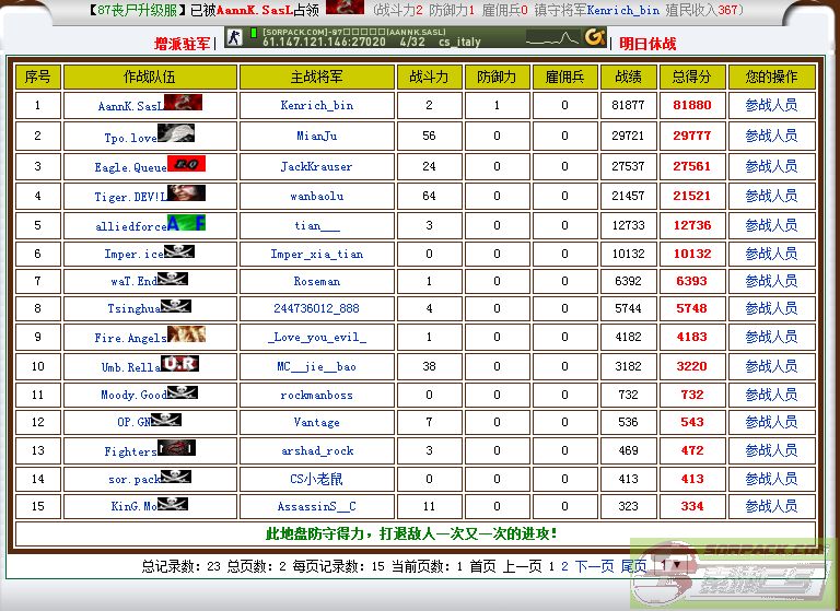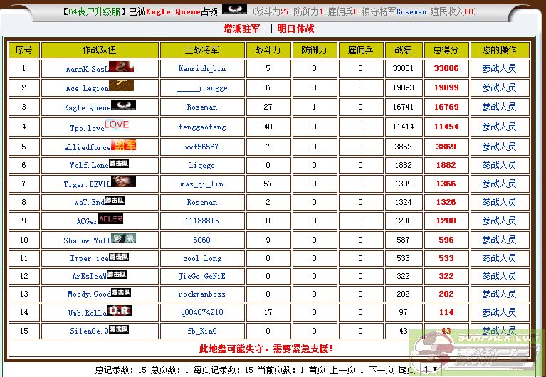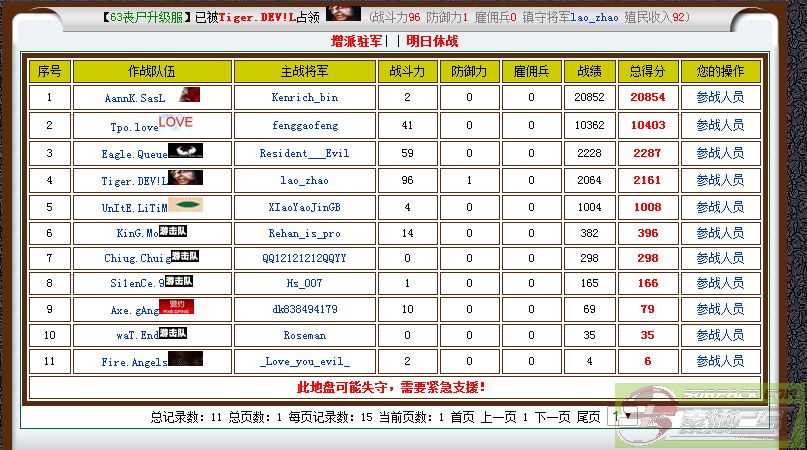| 序号 | 参战人员 | 最后交战时间 | 作战得分 |