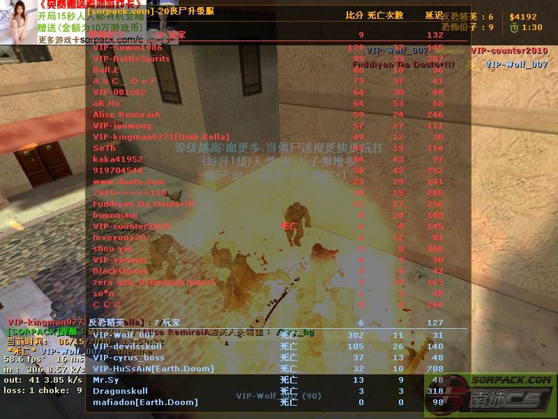 丧尸升级服 感染人类:50 被感染:11 消灭丧尸:460 杀死人类:5 总积分:515 等级:10