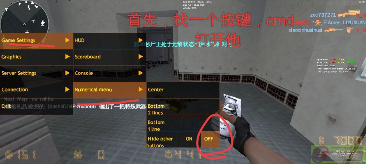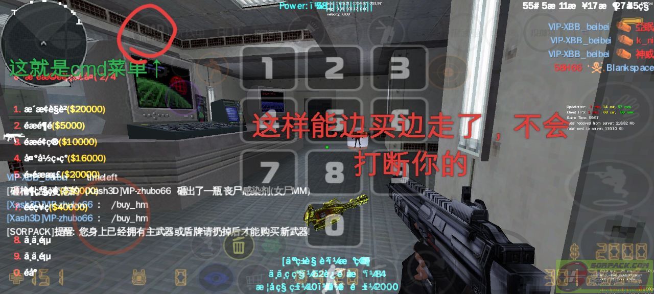 我相信大家在测试手机版中,进入丧尸升级服时,遇到过这种问题,就是开局先选武器,然后呢你走不了,选完你才可以走的,有的人,不能边走边买(边砸枪等),今天给大家解决一下,首先呢,你屏幕上有按键对吧,去找一个叫什么的,cmd menu(菜单),把他打开,点Game Settings到Numerical menu到Hide other buttos-把ON调到OFF这样你开局选武器能走了,不用担心选完才走了,这么着可以边走边买了。