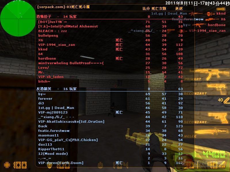 | 比赛混战服 | 杀人数:1946 死亡数:1241 爆头数:326 刀杀:74 雷杀:12 穿墙杀人:75 被闪杀人:2 | |